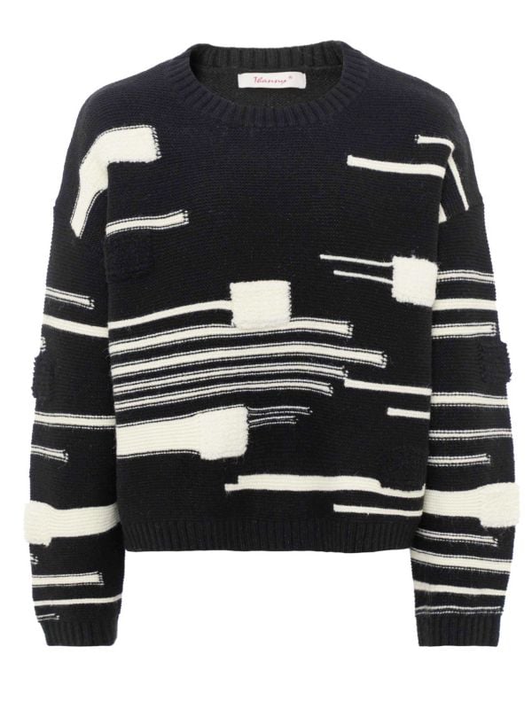The Stripe Patterned Jumper is a knitted crew-neck by Thanny. It features a graphic intarsia pattern with contrasting bands and raised block details that add texture and depth. Finished with ribbed trims at the neckline, cuffs and hem, the piece has long sleeves and varied stitch work across the body and sleeves, creating visual interest while retaining a comfortable, wearable feel. Pair with tailored trousers or denim for a considered layered look.