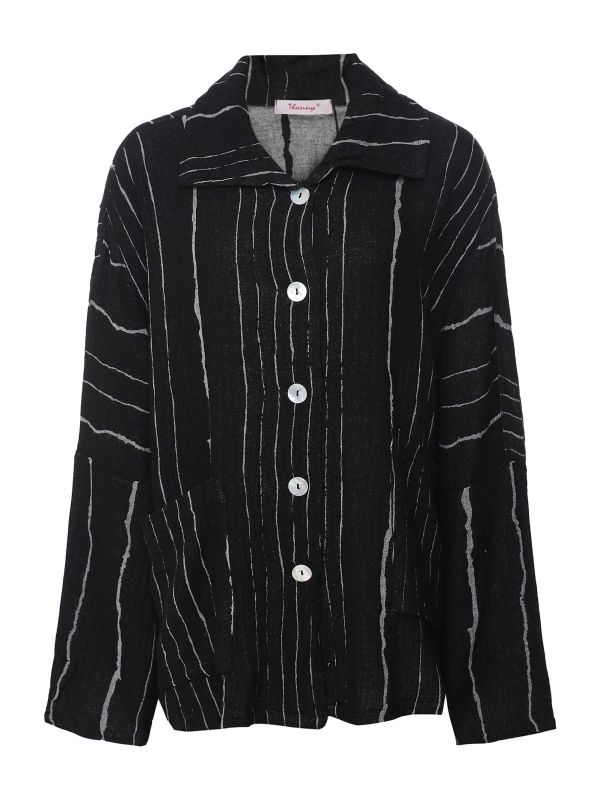 The Thanny striped shirt is a staple piece suitable for year-long wear. Crafted from a viscose-wool blend, the shirt has a crinkle effect with all-over contrast grey stripes. It features a wide, oversized collar, perfect for an underlayer below jumpers and sweaters. It fastens with large shimmery buttons and is complete with two front pockets.