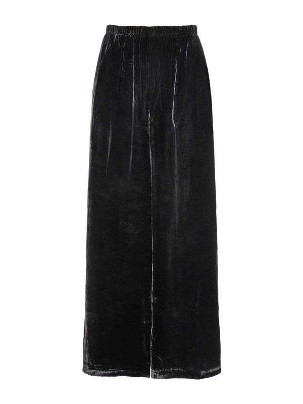 The Velvet Wide Leg Trousers by Thanny are cut in a wide silhouette with a soft velvet finish. An elasticated waistband creates a comfortable pull-on fit while a central seam adds a clean vertical line through the leg. The relaxed shape offers easy movement and a considered drape from hip to hem. Style with a fitted top or a tailored jacket to balance volume and create a refined, contemporary look.