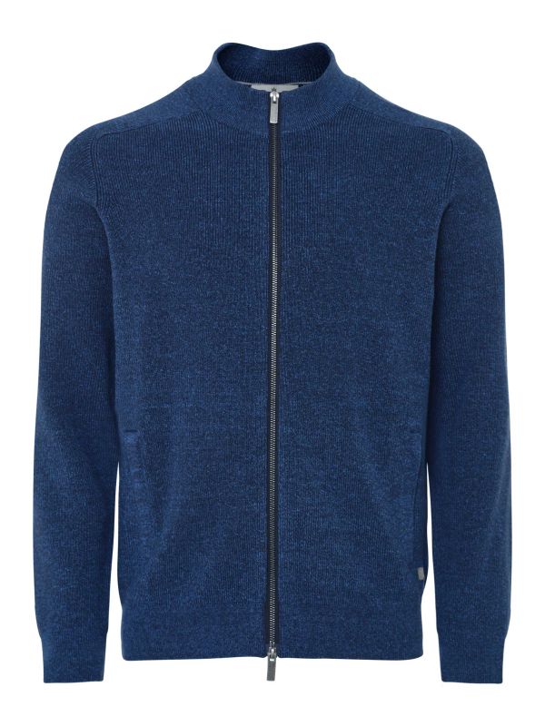 The rib knit texture adds subtle dimension, while the high collar and two-way zip closure create a sleek, contemporary look. Designed with side pockets for added functionality and finished with ribbed trims, this modern fit Thomas Maine cardigan strikes the perfect balance between smart and casual—ideal for layering over shirts or pairing with off-duty denim.