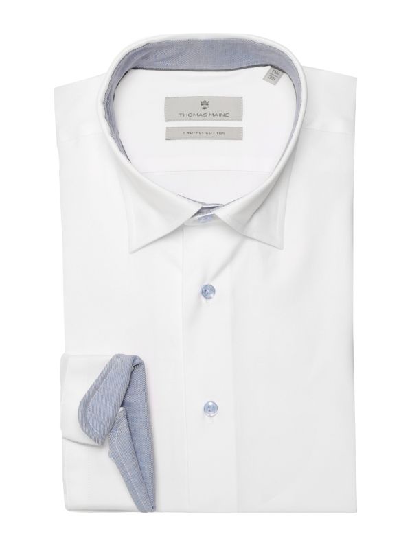 The Thomas Maine Bergamo shirt is set to freshen up your business profile. Expertly crafted in pure two-ply cotton and cut to a tailored fit, the white shirt ensures comfort and a sleek silhouette. Featuring a pointed collar with luxurious blue mother-of-pearl buttons, contrast trims and adjustable cuffs, with the label's signature logo embroidered at the cuff for an iconic finish.