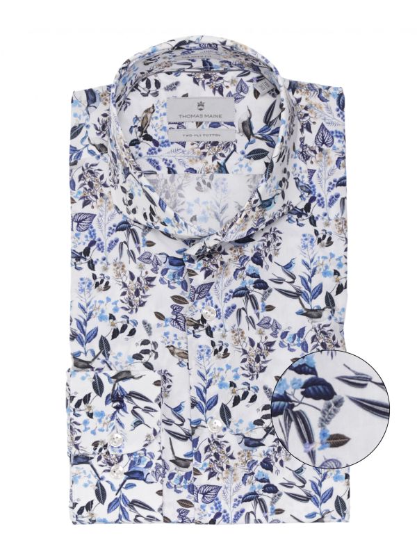 Introduce flamboyant pattern into your shirting with the Thomas Maine bird print Bari shirt. Cut to a tailored fit and crafted in premium two-play cotton, the shirt offers an exceptional drape and crisp appaearance. Featuring a cut away collar, French placket and adjustable buttoned cuffs, whilst the botanical bird print exudes a summer-ready aesthetic.