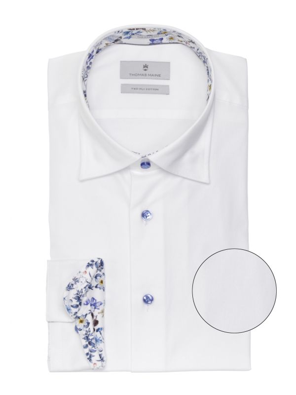 The Thomas Maine Bergamo shirt is set to add exquisite tailoring into your formal wardrobe. Cut to a tailored fit and crafted in Albini two-ply cotton, the white shirt promises a contoured silhouette and exceptional drape and comfort. Featuring a concealed button down collar, French placket and adjustable buttoned cuffs, whilst the playful floral print linings exude charming detail. Albini fabric expertly combines precious raw materials with expert craftsmanship for a garment that ensures quality and longevity.