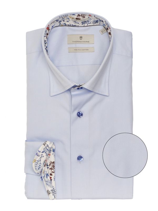 Elevate your formal wear with the Thomas Maine Bergamo shirt. Cut to a tailored fit and crafted in Albini two-ply cotton, the blue shirt promises a contoured silhouette and exceptional drape and comfort. Featuring a concealed button down collar, French placket and adjustable buttoned cuffs, whilst the playful floral print linings exude charming detail. Albini fabric expertly combines precious raw materials with expert craftsmanship for a garment that ensures quality and longevity.