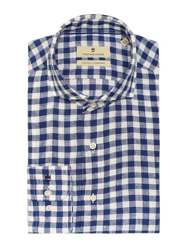 Introduce timeless pattern into your shirting choices with the Thomas Maine gingham Roma shirt. Cut to a tailored fit and crafted in premium linen, the shirt has been freshly laundered offering unbeatable softness, comfort and cooling qualities. Featuring a cut away collar, French placket and adjustable buttoned cuffs, whilst the embroidered logo to the cuff adds an iconic finish.