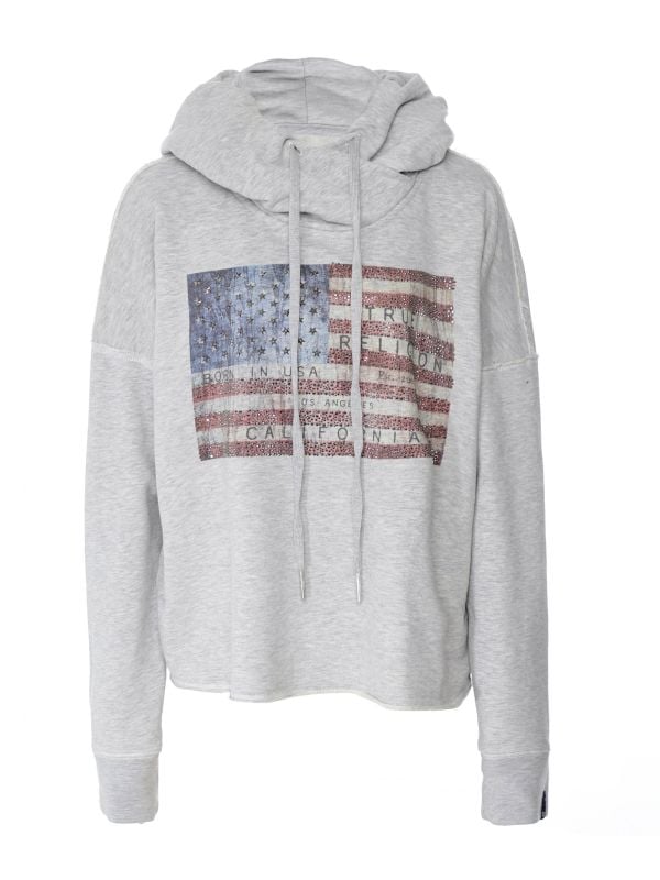 The True Religion American Flag hoodie is a staple piece for your everyday wardrobe, perfect for teaming with skinny jeans or joggers for a laid-back look. Made from a soft cotton blend, this ultra-comfy hoodie features dropped shoulders and a relaxed cropped hem, with an American flag print to the front that pays homage to the brand's roots. Studded detailing and a crossover drawstring hood complete the look.