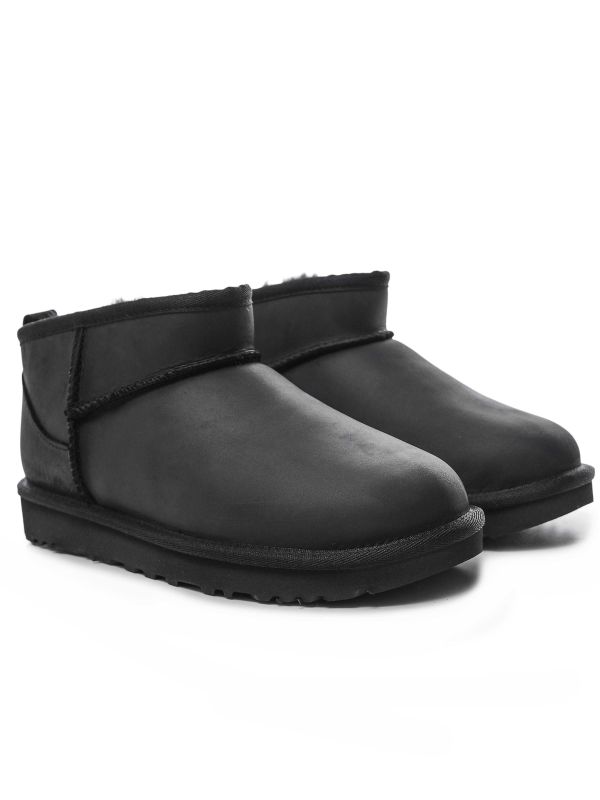 The Classic Ultra Mini Leather Boots by UGG are compact ankle boots designed for easy everyday wear. They feature smooth leather uppers, visible stitch trimming and a plush interior lining for added warmth. A low-profile textured outsole provides traction while a rear pull tab allows simple on-and-off wear. The silhouette is pared-back with an embossed logo patch at the heel for subtle branding. Practical and comfortable, these boots are made with visible quality finishes that support everyday use.