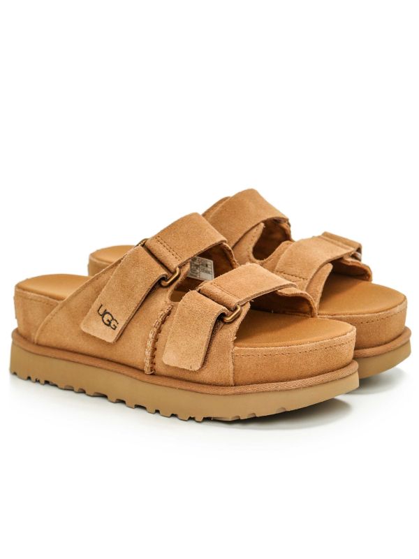 The UGG Goldenstar Hi slides redefine comfort and style with their luxurious design and innovative features. Crafted with premium suede uppers, these slides offer a touch of sophistication to casual wear. The padded construction ensures plush comfort with every step, while the adjustable Velcro vamp straps allow for a customisable fit. Inside, a mesh lining paired with a sockliner promotes breathability and moisture management for all-day freshness. The dual density foam footbed delivers superior cushioning and support, ensuring unparalleled comfort.