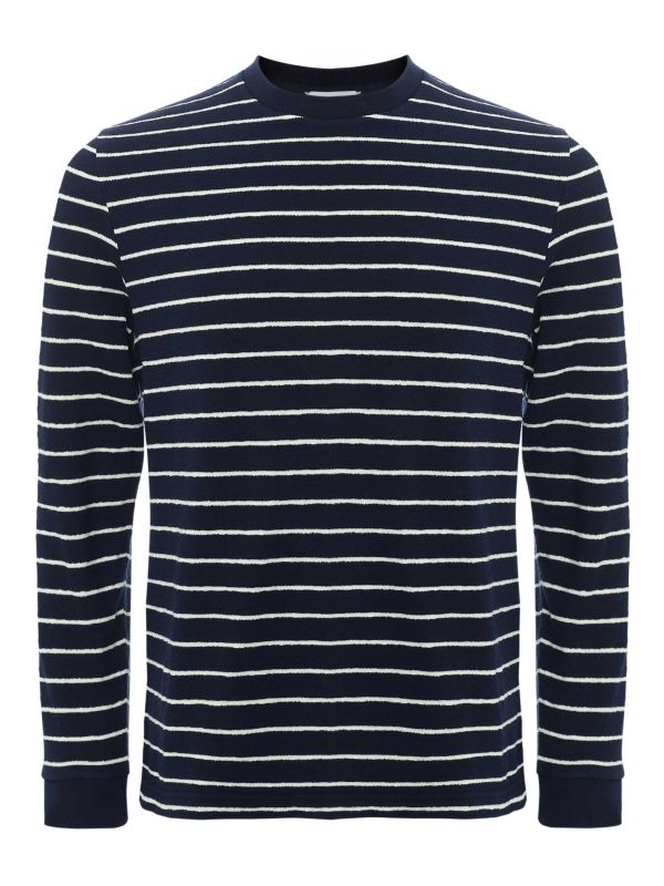 The unfeigned long sleeve striped t-shirt puts a fresh spin on a classic with its organic cotton blend in soft terry towelling for a textured feel. Cut to a regular fit, it features a timeless crew neck, long sleeves, and side slits that give it an easy, relaxed drape. The striped pattern adds a laid-back, nautical edge, making the unfeigned tee a versatile piece you can throw on with jeans, chinos, or shorts for effortless everyday style.