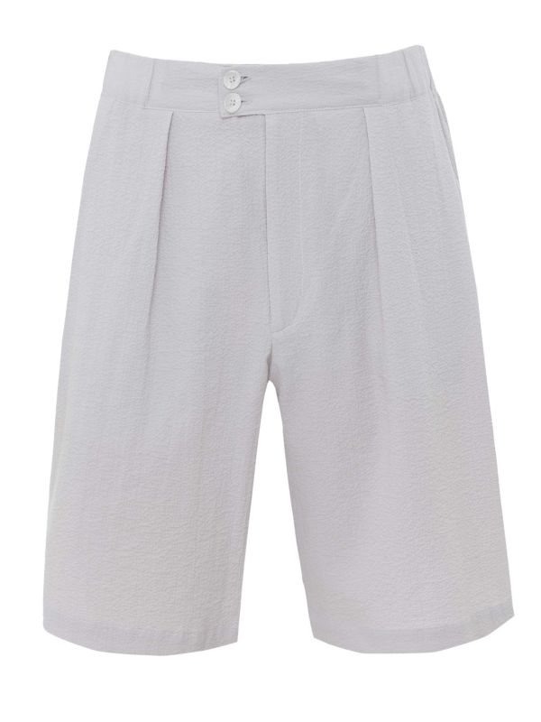 The unfeigned seersucker Bermuda shorts are a smart choice for warm-weather dressing, crafted from breathable cotton with added stretch for extra comfort. The textured seersucker fabric keeps things cool and lightweight, while the double-button elasticated waist and front pleats offer a tailored yet relaxed fit.