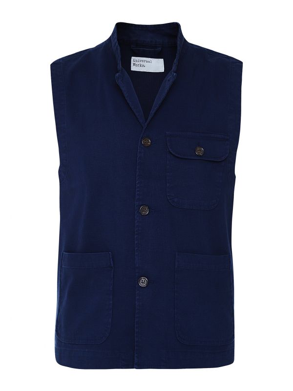 Showcase signature workwear style this summer with the Universal Works Battleman vest. Indigo-dyed for a rich colour and crafted in premium fine weave cotton with stretch, the vest offers a masculine silhouette and essential breathability. Featuring a stand collar with four button fastening, whilst the multi-functional three pocket front allows for easy storage when on the go.