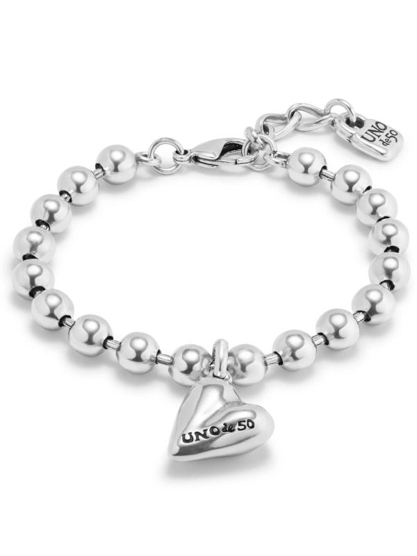 The UNOde50 Cupido Bracelet is 100% handcrafted in Spain from sterling silver-plated metal. It features pretty beads throughout and a delicate heart charm engraved with branding. Expertly made, this UNOde50 bracelet has timeless appeal while the heart detail adds a charming focal point. Perfect for wearing on repeat, this design will fit effortlessly into your everyday jewellery collection.