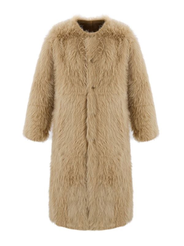 The Reversible Faux Toscana Coat by Urbancode is a longline coat with a high-pile faux fur finish and a round neckline. It fastens with a single-breasted row of buttons and includes practical side welt pockets. The reverse shows suede-effect panels with tailored seam detail for structure, while the plush interior offers added warmth. With full-length sleeves and a relaxed silhouette, this coat layers easily over knitwear and tailored trousers for a tactile, cosy yet considered outer layer.