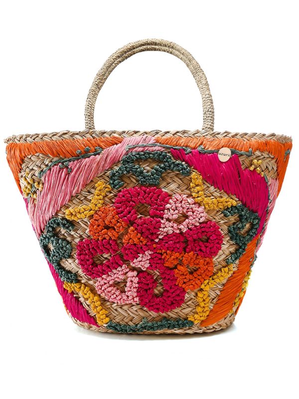 Get beach-ready with the Uzurii Capri raffia bag. This large raffia bag is perfect for summer holidays, offering ample space for your vacation essentials such as towels, swimwear and sun cream. The bag has two carry handles and features a bold flower detail to the front. It's complete with an open top and branded details.
