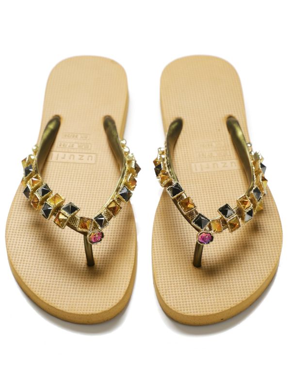 Add a touch of glamour to your casual summer looks with the Uzurii Darkness flip flops. Designed in Holland and expertly handmade in Brazil, these luxe sandals are perfect for your next holiday. They feature a comfortable rubber sponge sole, metallic PVC strap and toe post and distinctive crystal embellishment for a distinctive finish.