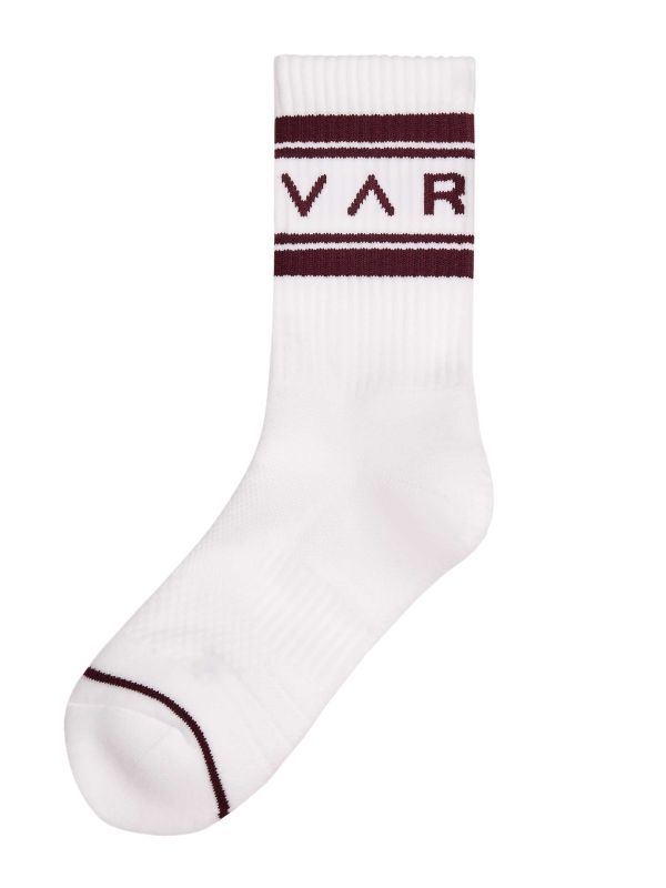 Varley's Astley Active Sock is a sport-inspired crew sock with a ribbed leg and clean banding that gives a modern athletic feel. Designed for everyday wear, the jacquard logo at the cuff and twin stripe detailing offer a subtle branded finish. The reinforced toe seam and piped toe edge provide extra durability, while the elasticated cuff helps keep the fit secure. Knitted construction gives a flexible fit that sits comfortably under Sneakers or with casual footwear.