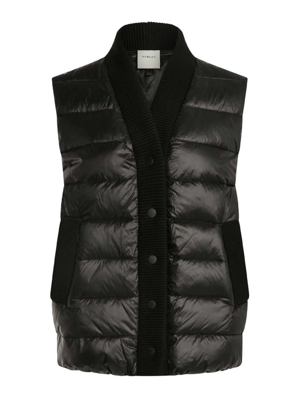 The Colwyn Boxy Gilet is a padded, quilted sleeveless vest from Varley. Designed with a ribbed shawl collar and matching ribbed placket, it fastens with branded snap buttons and has two rib-trimmed welt pockets for essentials. The boxy cut offers a relaxed silhouette that layers easily over knits or lightweight jumpers. Lightweight padding provides warmth without bulk and horizontal quilting adds subtle texture, making this gilet a versatile layering option for transitional weather.