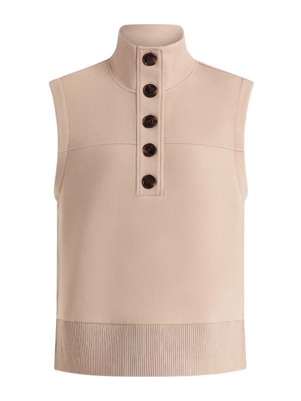 The Varley Conall Button Tank is a sleeveless top with a sculptural funnel neck and a five-button front placket. It features a stitched yoke, wide ribbed hem and side splits that sit neatly over Pants. The relaxed, boxy silhouette layers under blazers or over lightweight shirts for transitional dressing. Large tortoiseshell-effect buttons add tactile contrast while the structured fabrication keeps the shape. Style it with tailored Pants or relaxed denim for a considered, modern outfit.