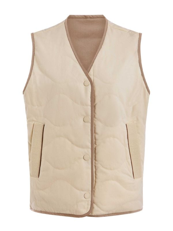 The Lori Reversible Gilet is a versatile quilted layer from Varley. It features a reversible design with contrasting finishes, making it two looks in one. The sleeveless silhouette is lightly padded with a wave-quilt stitch and finished with neat contrast binding and a central seam at the back. Press-stud fastening and two slanted welt pockets with ribbed trims keep the look functional. The pared-back, boxy cut layers easily over shirts and sweaters for everyday styling.