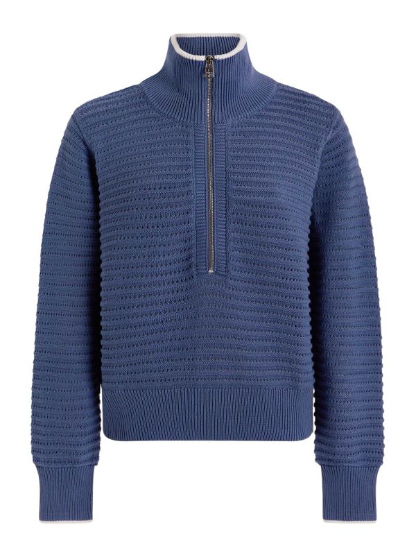 The Morwenna Half-Zipper Knit from Varley is a knitted layer defined by its openwork horizontal texture and a high ribbed funnel collar with contrast tipping. A half-length metal Zipper fastens the front and the Sweater is finished with ribbed cuffs and a wide ribbed hem. Designed for layering, it sits comfortably over shirts or lightweight tops and pairs neatly with casual shorts or tailored Pants. The structured trims bring clean lines to the textured body, offering an easy way to introduce tactile detail into everyday outfits.