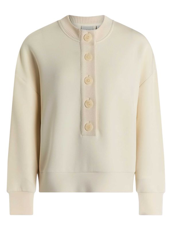 The Reena Button Front Sweat from Varley reinterprets the classic sweatshirt with a vertical button placket and oversized buttons for a crisp, architectural finish. Cut for a relaxed, slightly boxy fit with dropped shoulders, it features a ribbed crew neck, extended cuffs and a wide hem for subtle structure. Wear it tucked into tailored Pants or teamed with matching joggers for a coordinated look. The pared-back silhouette and considered detailing make it an adaptable piece for weekend and travel wardrobes.