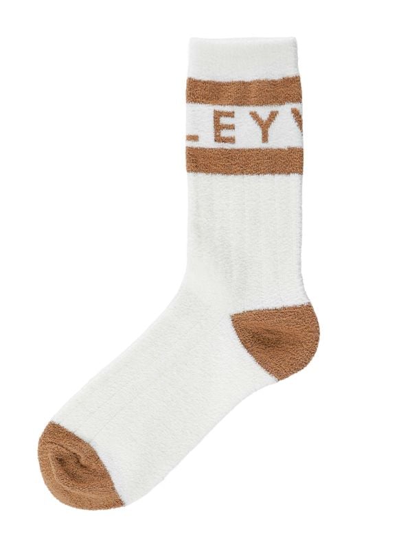 The Varley Spencer Socks are made from a plush, looped knit for a cushioned, wearable feel. They feature a mid-calf silhouette with a ribbed leg and wide jacquard logo band at the cuff. Contrast heel and toe panels add visual interest while the elasticated cuff keeps the fit secure. The soft pile construction offers gentle cushioning and a cosy handfeel, making them an appealing addition to lounge or athleisure looks. Wear under trainers or slippers for textured comfort through the seasons.
