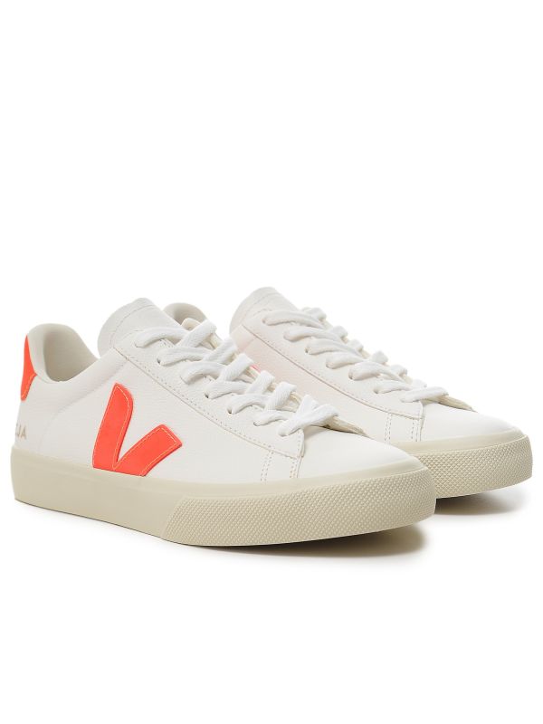 Step up your sneaker game with the chic VEJA Campo trainers, where urban sophistication meets eco-conscious design. Crafted from sleek ChromeFree leather, these white beauties flaunt a vibrant pop of orange fluo details that elevate their playful charm. Their iconic V-logo is not just stylish but a nod to their sustainable ethos.