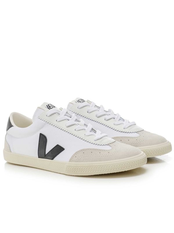 The VEJA Volley trainers, inspired by classic volleyball shoes, are a testament to eco-conscious design and craftsmanship, made in Brazil. These sneakers feature organic traced leather uppers and suede panels for a sophisticated yet sustainable look. The distinctive Amazonian rubber V logo stands out, complementing the shoe's white base with black detailing.
