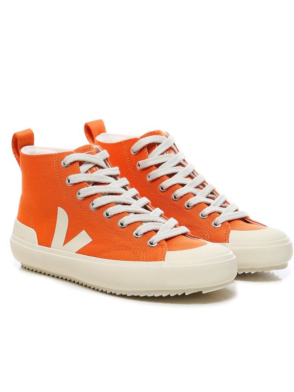 Add a pop of colour to your casual outfits with the Veja Nova high top sneakers. Combine sustainability and lasting style with these sneakers as they have been crafted from a recycled EVA and organic cotton blend to the insole. Featuring screen printed v logos to the sides and pull on heel tabs the lace up sneakers are complete with gripped Amazonian rubber soles.