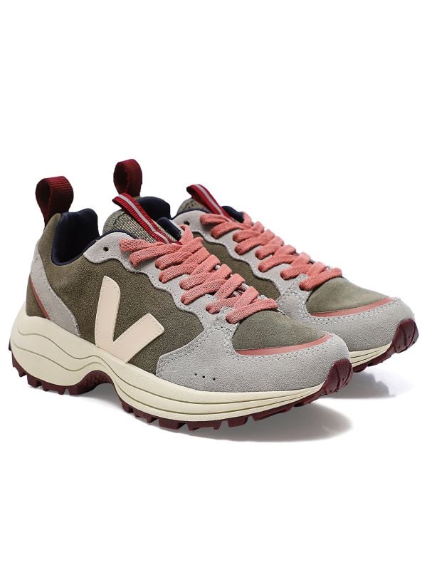 The Veja Venturi sneakers offer a cool, modern look and are made from a combination of environmentally friendly and sustainable materials. Crafted with a suede upper, classic lace-up fastening, suede V branding and mixed fabric panels, these stylish sneakers are a versatile option to complete all your off-duty ensembles. This style has a khaki suede base with pops of grey, pink, navy, red and cream and is complete with a tech inner lining made from recycled plastic bottles, developed to provide maximum comfort and flexibility.