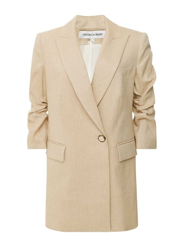 Meet the Veronica Beard Kimmel Dickey Jacket, made for pairing with a dickey while working effortlessly on its own. Crafted from a twill-linen blend, this blazer-style jacket is perfect for transitioning into the warmer season. It features an elegant collar, single button closure, ruched 3/4 length sleeves with decorative buttons to the cuffs and flap pockets to the front. With the zipper feature to the lining, a dickey can easily be worn underneath to complete the look.