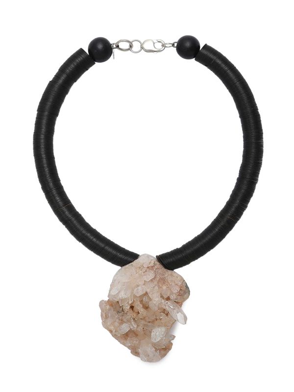 The Gemstone Necklace by Veronique Designs is available in Garden Quartz, Smokey Quartz and Fluorite. It features the gem stone suspended from a stacked-disc beaded collar. Round spacer beads sit either side of the pendant and the piece fastens with a lobster-claw clasp and multiple jump rings for an adjustable fit. The design pairs artisanal textures with architectural form, creating a strong focal accessory to lift tailored or evening looks. Each crystal shows natural variation, so every necklace is unique.