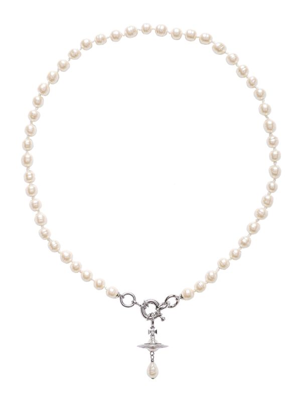 The Vivienne Westwood Aleksa necklace is sure to add that glamourous finish to any look. Crafted in pure metallic-tone brass with glass-based baroque pearls, the necklace showcases a stunning aesthetic. Featuring a spring lock fastening, whilst the label's famous Orb is adorned with dazzling preciosa crystals.