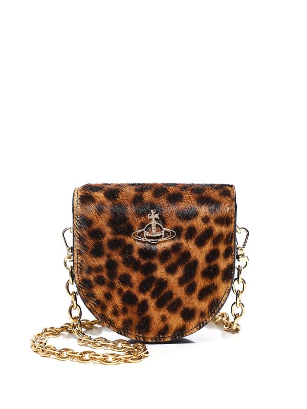 The Vivienne Westwood nano saddle crossbody bag is a versatile accessory that can be worn on the shoulder or as a belt bag. Crafted in smooth leather and calf hair, this leopard print flap bag has a magnetic closure and opens to a spacious compartment. The bag is fitted with a detachable chain strap and is complete with gold-tone hardware and a signature Orb plaque at the front.