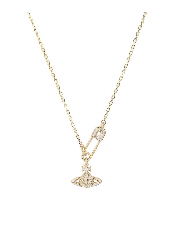 Add a glamorous finishing touch to your ensembles with the Vivienne Westwood Lucrece pendant. Beautifully crafted in rhodium plated brass, this elegant necklace features a timeless Orb pendant with a punk-inspired safety pin detail, both encrusted with glistening cubic zirconia crystals. The necklace is complete with an embossed tag detail and a classic lobster clasp closure.