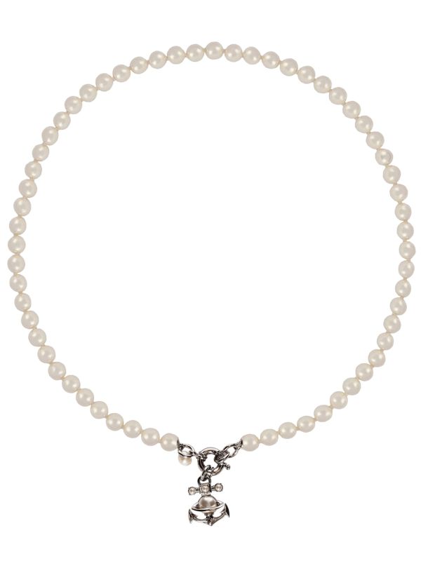 Add a statement finishing touch to any look with the Vivienne Westwood Marialena pearl necklace. This eye-catching piece features a row of Swarovski 6mm glass-based pearls and is complete with a 23mm anchor motif and iconic Orb Saturn ring detail. The necklace is presented in a branded box, making it the perfect gift for a loved one.