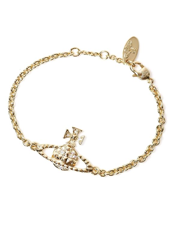 The Vivienne Westwood Mayfair bracelet is the ultimate addition to any glamorous woman's jewelry box. Featuring the label's signature bas-relief Orb charm and adorned with textured studs, whilst accented by sparkling Swarovski crystals for a dazzling finish. This beautiful Westwood bracelet will add a touch of elegance to your accessories.