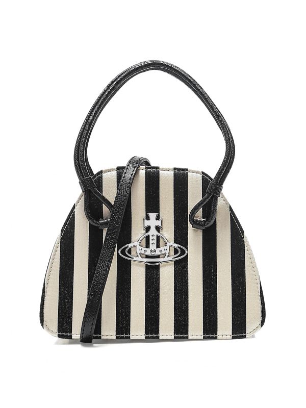 Add an elegant finishing touch to your looks with the Vivienne Westwood Pavillon Mini Yasmine bag. This small crossbody bag has a canvas shell crafted from cotton and silk and features a statement vertical striped pattern in black and cream. The bag features a snap button fastening, double carry handles and an adjustable crossbody strap, while the iconic Orb emblem to the front provides an authentic finish.