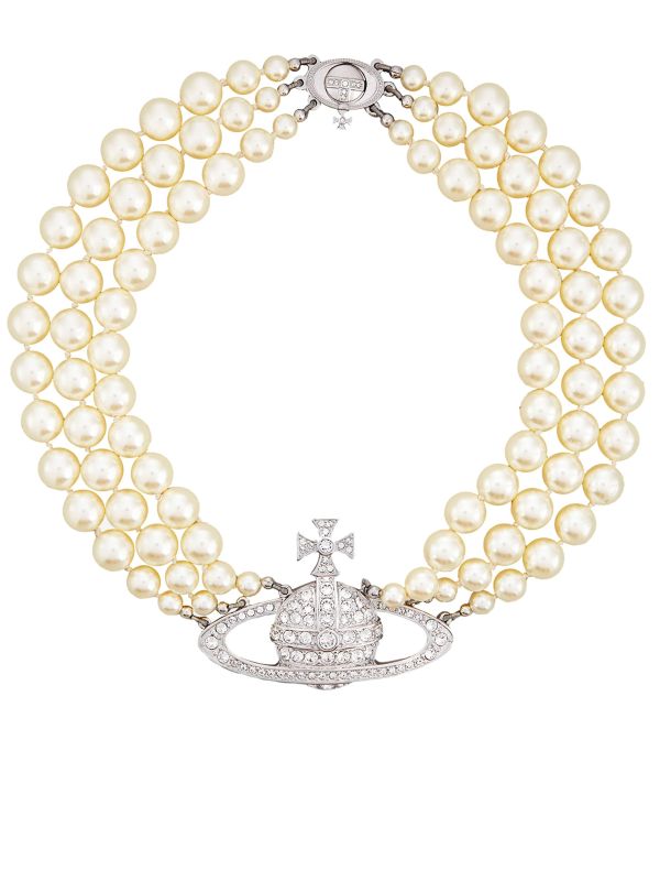 Make a bold statement with the Vivienne Westwood pearl choker. With three unique and feminine rows of Swarovski pearls, the necklace boasts the label's famous Orb at the centre. The Vivienne Westwood choker will ensure sophistication and elegance at your next formal event and is presented in a branded box making for an ideal gift idea.