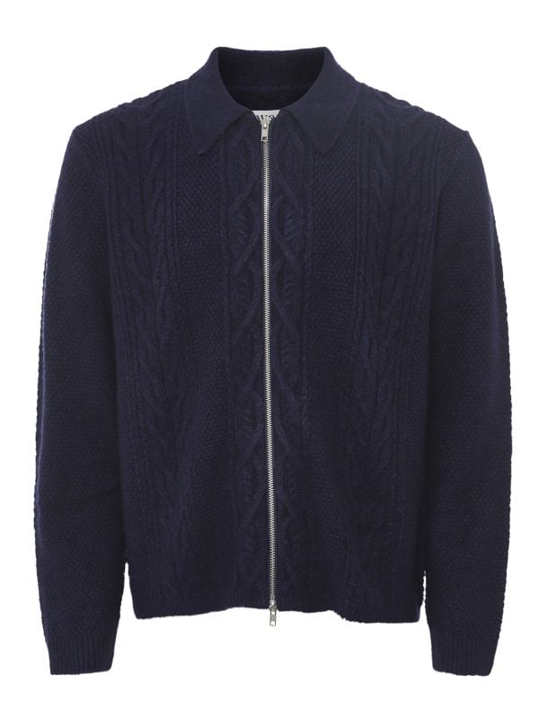 The Wax London Friar cardigan is a cosy yet stylish layering piece crafted from a wool and mohair blend for warmth and softness. Featuring a classic cable knit design, it brings texture and character to your wardrobe.
