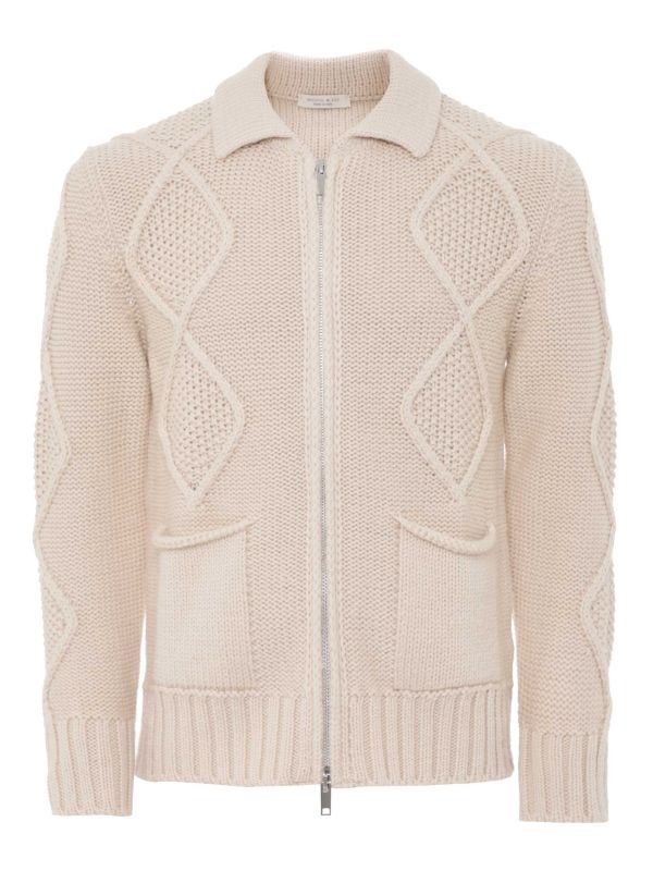 The Wool and Co zip cardigan is a modern twist on a classic knit, crafted from soft merino wool with a mix of waffle and cable textures for added depth. It features a smart shirt collar and a two-way zip closure, making it easy to layer and style. Ribbed trims and front patch pockets add both comfort and practicality, while the regular fit ensures a relaxed yet refined look. Made in Italy, this Wool and Co cardigan effortlessly blends style and everyday wearability.