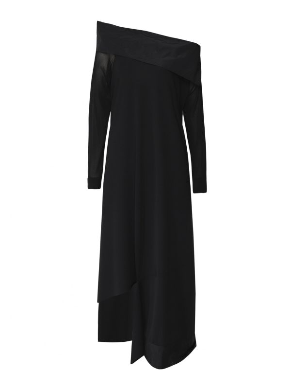 Make a statement in the Xenia Design off the shoulder maxi dress. Boasting a beautifully distinctive design, this elegant dress features an off the shoulder taffeta neckline, sheer long sleeves and an asymmetric hem with contrast fabric trim. Wear yours with with heels and minimal jewelry for a sophisticated look.