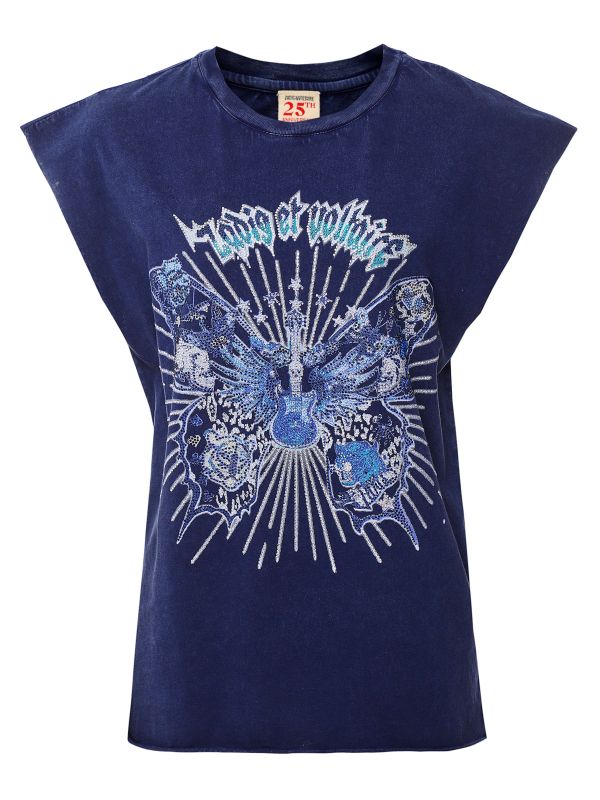 Get a cool, casual look with the Zadig & Voltaire Cecelia t-shirt. This slouchy tank top features a ribbed round neckline, short sleeves and straight hem, while a butterfly and guitar motif to the front add a glam rock'n'roll edge. The tee is complete with a logo slogan detail to the back.