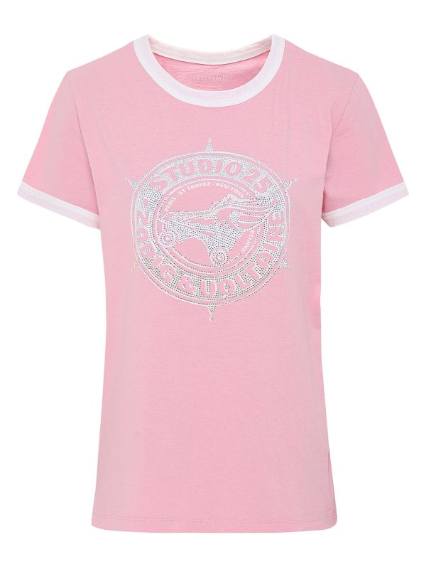 The Zadig & Voltaire Zoe t shirt is set to add retro vibes into your summer attire. Crafted in pure cotton jersey, the short sleeve tee will ensure day-long comfort. Featuring a contrast ringer neck and cuffs, whilst the printed diamante Studio 25 graphic lends statement impact.