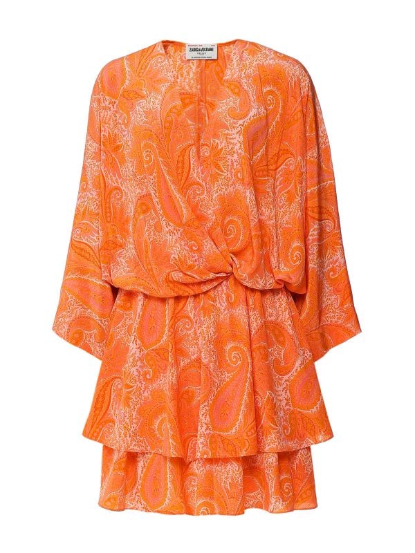 The Zadig & Voltaire Hailey dress experiments with volume and drapes. Elegantly crafted in pure silk, the dress showcases a super light and soft handle. Featuring a stunning wrapover neckline, fitted waist and flounced skirt, whilst the long sleeves with flared cuffs lend bohemian style. The Zadig dress is complete with a paisley print for a key seasonal appearance.