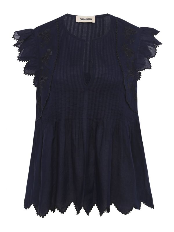 The Zadig & Voltaire Tiara top is an elegant piece for your spring/summer wardrobe, perfect for all occasions. Cut from 100% cotton, this lightweight top features a round neck with open front, stylish cap sleeves with embroidered detailing and pleating to the front and back, while a chic scallop hem completes the look.