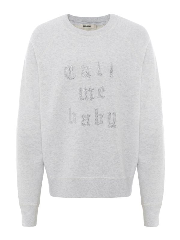 Discover Zadig & Voltaire's Upper Sweatshirt, a relaxed essential with sparkling details. This distinctive Zadig & Voltaire sweatshirt is constructed from light grey marl fleece. It has a round neckline, long sleeves and gently ribbed edges, finished with the "Call Me Baby" inscription embellished with rhinestones across the chest. This blend of comfort and statement style makes this a winning piece for any wardrobe.