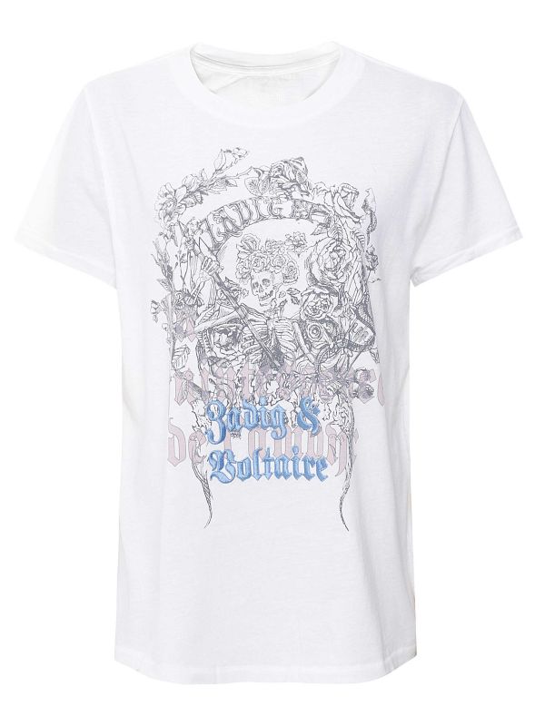 The Zadig & Voltaire Walk Skull Reaper t-shirt is a casual tee made from 100% cotton. It has a round neckline, short sleeves and a contrast grey print on the front featuring a skull and floral design. In addition, it has pink printed lettering and the Zadig & Voltaire branding embroidered in blue.