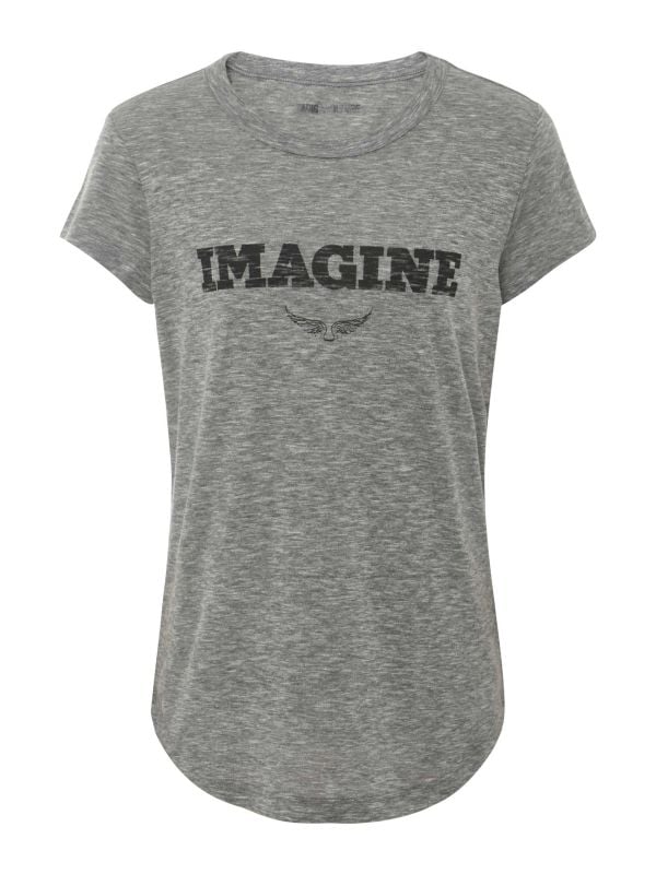 Update your t-shirt collection with the Woop Imagine T-shirt by Zadig & Voltaire. Featuring a round neckline, short sleeves and a worn-look "Imagine" print and signature wings on the front, this Zadig & Voltaire t-shirt is crafted from a cotton and recycled polyester blend. It's mottled grey shade adds to the worn-effect, offering a relaxed look that goes with everything.